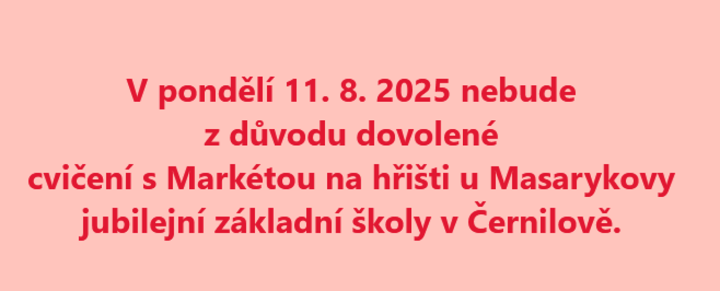 V pondělí 11. 8. 2025 nebude z důvodu dovolené prázdninové cvičení u Masarykovy jubilejní základní školy v Černilově
