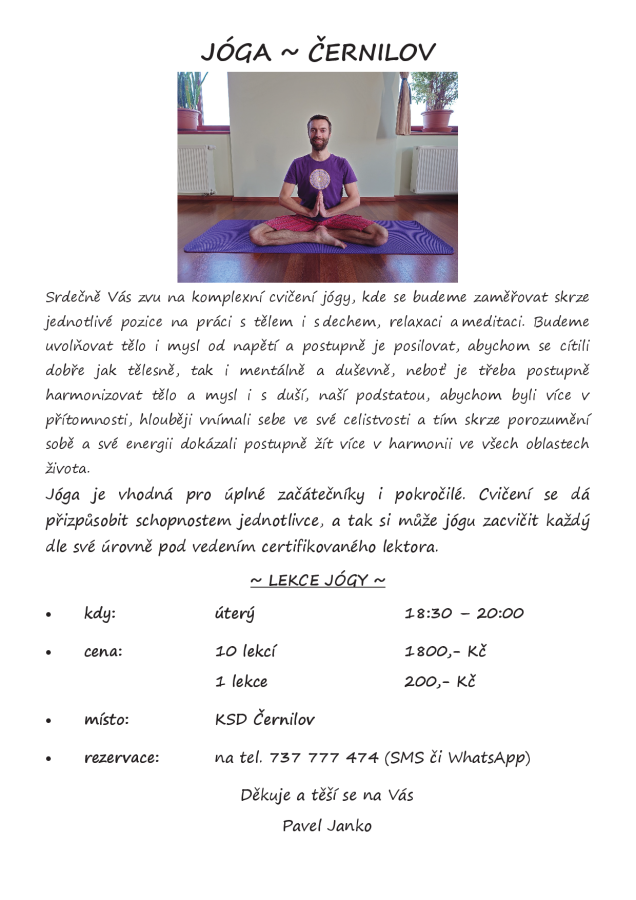 Každé úterý si můžete přijít zacvičit jógu pod vedením zkušeného lektora pana Pavla Janko. Cvičí se od 18:30 do 20:00 h v Kulturním a spolkovém domě v Černilově.