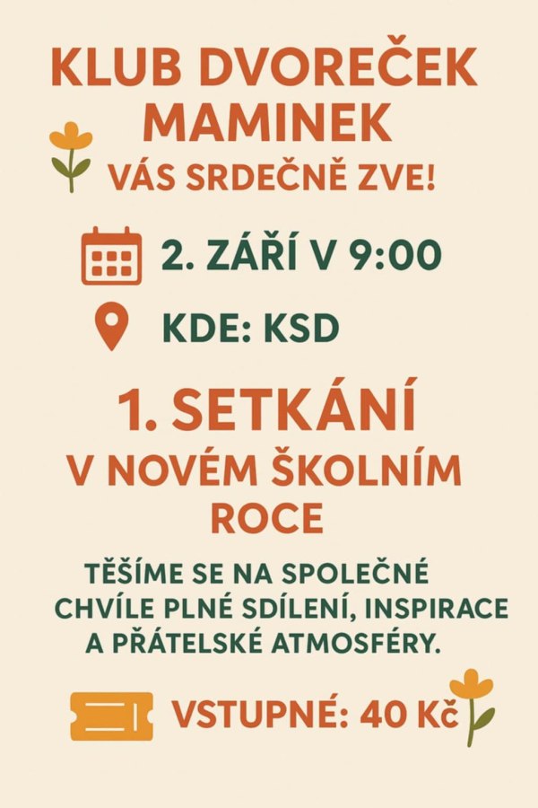 Klub maminek Dvoreček se opět sejde po letních prázdninách v úterý 2. září 2025 od 9 do 11 h v dětské herně v přízemí Kulturního a spolkového domu v Černilově, na adrese Černilov 215.