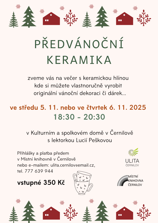 Předvánoční keramická dílna s Luckou Peškovou v Kulturním a spolkovém domě v Černilově ve čtvrtek 6. 11. 2025 ve výtvarné učebně v 1. patře.