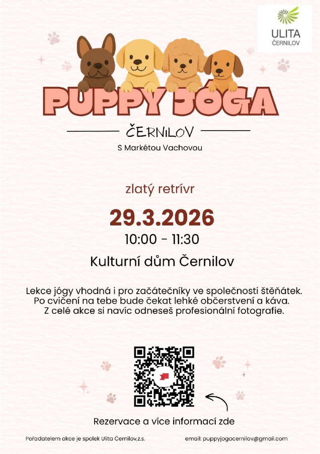 Puppy jóga se bude konat v neděli 29. 3. 2026 od 10 hodin v Kulturním a spolkovém domě v Černilově, v sále v 1. patře.
